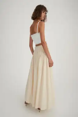 A maxi style skirt cut in textured 100% cotton fabrication the Costello skirt features 3 gathered panels at the top of the waist fitted to the body flowing out from the lower hip.