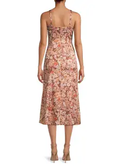 From the Body Heat Collection. This midi dress is made of satin with a floral print, featuring an underbust cut-out at the waistline.