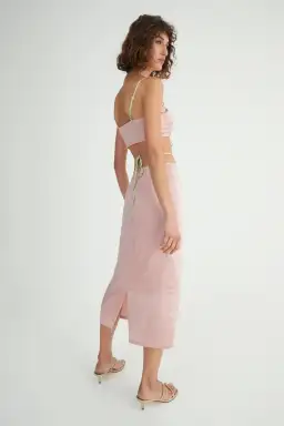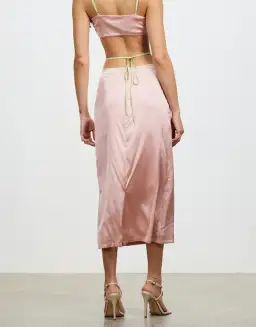 Skirt - The Mariika Skirt is cut in our gorgeous two tone blush and melon colourway. This classic cut midi syle features a cutout at the CF and a wrap waist tie. Pairs perfectly with the Cali Top for a matching set