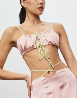 Top - The Cali Top is cut in our gorgeous two tone blush and melon colourway. It features drawstring ties which create gathers around the neckline and hem. Cut in a soft silk satin fabrication this top looks beautiful paired back with the Mariika Skirt as a set