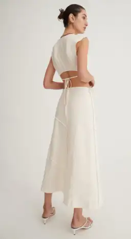 The Cataline Top in Sand is a v neckline cut featuring a tye at the back highlighting the silhouette of an open back