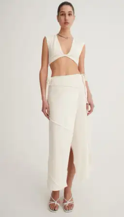 The Catalina Skirt in Sand is a full-length, wrap-style skirt, featuring exposed overlocking details throughout the side seams and a tye on the waistband.