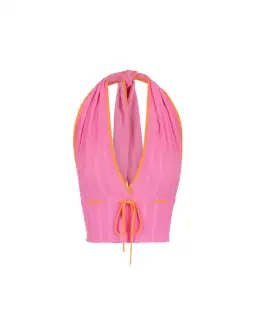 The Grapefruit Frannie Top is a fitted halter top with a cropped fit. It features a V-neckline, contrast neckline and armhole bind, and a ribbed knit texture. The top is accentuated by a slightly A-line hem and a contrast threaded tie detail. Perfect for a trendy and contemporary look that effortlessly stands out in any setting.
