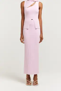 Our best-selling Romee Knit Set is now available in Musk. Constructed in a delicate, variegated-rib fabrication, featuring asymmetrical twist-panel detailing on both the front and back of the body.