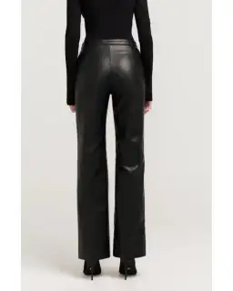 This vegan leather pant can add high fashion and edgy elegance to any look. Made from 100% vegan leather, it features a relaxed shape, high waisted and straight leg fit that can easily be dressed up or down.