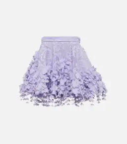 The High Tide Lace Flip Mini Skirt in Periwinkle from Zimmermann Resort 2023 Collection, High Tide. A lace mini skirt featuring lace mounted onto stiff mesh, a grossgrain ribbon inserted at the waistband, flower and pearl trim and a crinoline tape hem.
