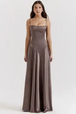 Cut from a lustrous Taupe silky satin for a fluid drape, 'Anabella' features a flattering neckline with delicate rouleau shoulder straps. The bodice has a curved hem that sits below the natural waistline and we're loving the corset inspired lace up back for a vintage feel.