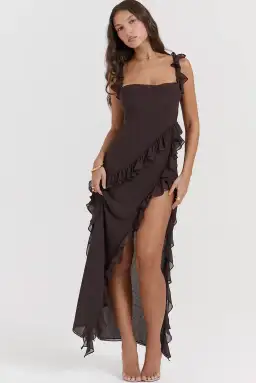 House of CB Ariela Ruffle Maxi Dress in Expresso Brown