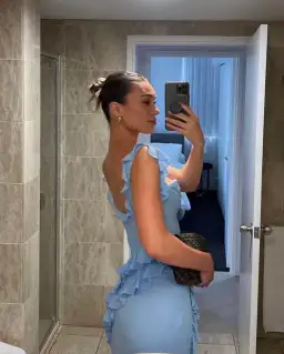 "Our 'Ariela' dress is beautifully embellished with fluttery ruffles that add pretty dimension to this ultra sexy silhouette. Cut from lightweight georgette, 'Ariela' is elegant and striking in a soft blue hue. It has a draped cowl neckline and effortlessly skims over your curves with a thigh high split to showcase the legs in a floaty finish.