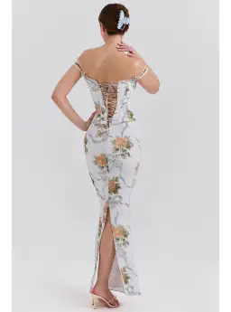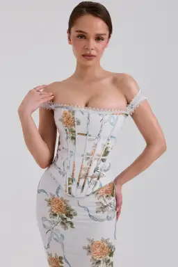 Old Hollywood energy with a modern edge. The Cammie is an off-shoulder corset gown that sculpts the waist and frames the décolletage with its signature House of CB boning. Made from structured duchess satin, it hugs in all the right places and moves like a dream.