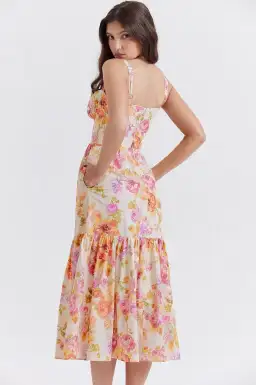 Spring feels in our 'Elia' midi dress. Cut from stretch cotton that's printed with a beautiful floral pattern, 'Elia' is ultra feminine and has a pretty sweetheart neckline with underwired cups for ultimate support and bust flattering cleavage. The bodice is fitted with our signature corsetry boning to cinch the waist and the thing we love the most is that Elia has pockets.The shoulder straps adjust for the perfect fit and we love how the billowing, tiered skirt adds feminine drama to this gorgeous vintage creation. It zips up the back for easy on and is fully lined for comfort. Wear yours with our 'Lola' white mid heels. The 'Regular' cup option suits cup size A-C whilst the 'Bigger' cup option suits cup size D-E.WHERE TO WEAR:Romantic date nights, garden parties, strolling the Farmer's markets, picnics, champagne afternoon teas, vacays.TEAM YOURS WITH:Delicate kitten heels or 'Lola' white mid heels and a raffia bag.UNDERWEAR SOLUTION:No bra required as it's cupped and lined.Made from stretch cotton. Fully lined.Stretch Factor: 1/3Designed For House Of CBShop more Midi Dresses hereDress Length: Approx 125cmMaterials: Stretch Cotton, Stretch Woven, Heavy RayonGentle Dry Clean OnlyModel is 5 ft 8 and wears size XSColour may vary due to lighting on images.
