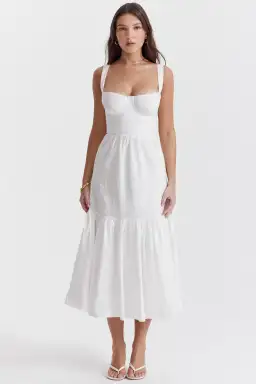 Sweetheart neckline with underwired cups for ultimate support and bust flattering cleavage. The bodice is fitted with corsetry boning to cinch the waist.The shoulder straps adjust for the perfect fit. It zips up the back for easy on and is fully lined for comfort.