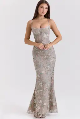 House of CB Naima Embellished Beaded Corset Maxi Dress Silver size 6