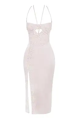 Our 'Georgia' midi dress is defined by the pretty floral lace that creates such a beautiful, romantic feel in a delicate crystal hue. Cut from our ultra luxe, light silky satin and corded lace, 'Georgia' features the prettiest lace bodice with underwired cups that are lightly padded for comfort and support and has a small cutout to the front with halterneck ties that crossover at the back for the perfect fit.