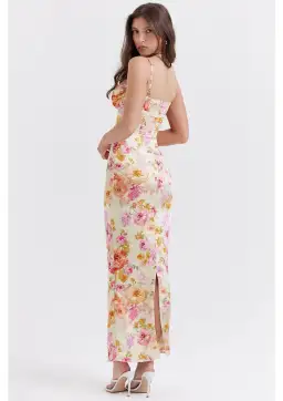 Soft, sculpted, and straight out of a summer daydream. The Josefina is crafted from stretch satin with a body-contouring corset bodice, delicate straps, and a subtle side split. Its vintage rose print adds just the right amount of romance to a clean, feminine silhouette.