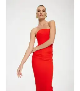 Astor Strapless Midi Dress in Cherry Red, features a striking curved neckline that makes a bold statement. Detailed ruching across the hips enhances your silhouette, while a back split ensures ease of movement, perfect for any occasion.