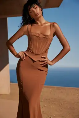 Corset: The caramel corset is the perfect addition to your Autumn wardrobe. Cut from sheer viscose and stretch crepe, it has a bust flattering square neckline and features our signature boning to cinch the fit for a tiny waist.