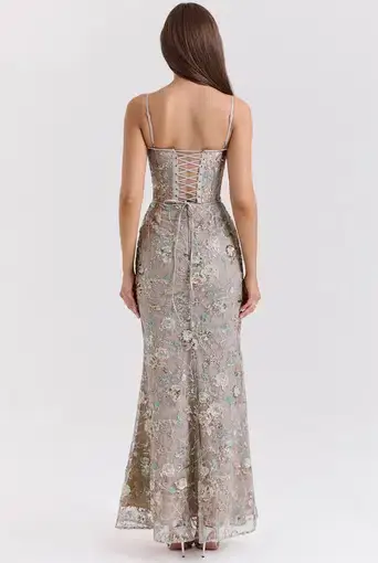 The ethereal 'Naima' dress will leave you breathless. This incredible design is embellished with beautiful florals and sparkling beads on a sheer tulle base. The shape continues to stun, and our signature corsetry comes into play to create a cinched silhouette. The shaped neckline and defined waist aim to flatter, while the skirt falls from the hips to a floor-sweeping maxi length for a touch of drama.