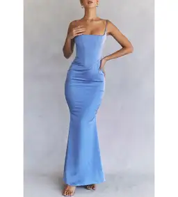 Romantic silhouettes and elegant glamour is what makes our new season collection feel so special and 'Olivette' ticks all the right boxes. Cut from our lustrous silk satin in a delicate Periwinkle hue, 'Olivette' has a close fitting silhouette for an ultra feminine hourglass shape and the curved neckline and slim adjustable straps frame the décolletage so beautifully.The bodice has a pointed hem that dips below the waistline and features our incredible corsetry boning to cinch the waist. The skirt is relaxed below the knee with an elegant mermaid shape that sweeps the floor in a flattering maxi length. It is fully lined for comfort and has a zip to the back for easy on. Wear yours with our 'Lucent' mules for those glam functions and events.