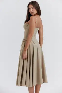 'Samaria' is your all-Summer one and done dress. Cut from a breathable twill fabric, it's boned through the bodice to cinch the waist and has a sweetheart neckline with underwired cups. The barely there straps adjust for the perfect fit and we love how the gathering adds pretty volume to the midi skirt.