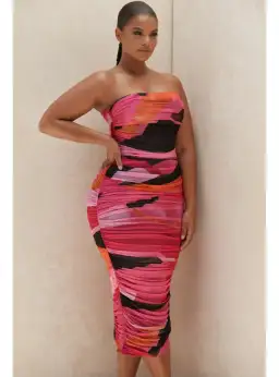 The hottest dress from our Paradise Nights collection has landed. Cut from our softest and silky ruched organza mesh, 'Sasha' has an inbuilt underwired bra and a power mesh lining layer that acts just like shapewear within the dress for a smooth and seamless silhouette. It has a flattering strapless cut, gorgeous tropical tones and is suitable for all bust sizes. We love this teamed with simple black strappy sandals for your summer nights out.