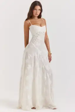 The House of CB Seren Maxi Dress in White (Size XS / AU 6) is effortlessly romantic and made to float through special occasions. Crafted from a semi-sheer floral jacquard in a soft vintage cream, it features delicate straps, a corset-style bodice with a lace-up back, and a flattering curved waistline that flows into a full-length skirt. Fully lined for comfort, it gives off modern fairytale energy — subtle, elegant, and unforgettable.