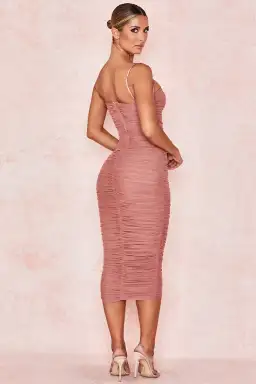 Turn heads in the House of CB Sirene Midi Dress in Antique Rose. This gorgeous dress is cut from luxurious gathered organza mesh that is slightly sheer and features delicate spaghetti straps. The bodice features an inbuilt underwired bra so you can go braless if you wish, or you can fit a strapless bra under if you’d prefer.