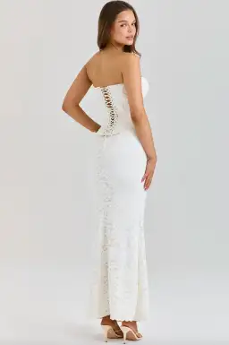 Set to stun at any special occasion, the captivating beauty of 'Solaine' catches every eye. This all-in-one floral lace number gives the illusion of a corset and skirt pairing. You'll find the delicate lace fabric is meticulously crafted to a classic corset top with intricate boning and an underwired bust that provides enough support to leave your shoulders on display. At the back, you can increase the cinch with our signature lace up back and there's a side zip for added comfort.