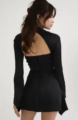 Our 'Toira' mini dress is so fun and flirtatious, making it perfect for romantic date nights. Made from our lustrous silk satin in timeless black, 'Toira' is cut on the bias and has so many pretty details. The cross-front halter shape is so flattering and creates a skin-baring open front with a beautifully draped cowl neckline.