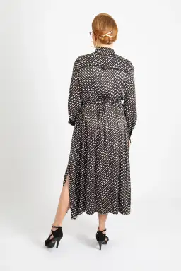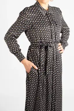 An elegant shirt dress by BOSS Womenswear. Featuring an all-over monogram print in signature-stripe colours, this long-sleeved dress is crafted in fluent fabric, trimmed with logo lettering at the rear yoke and finished with chest pockets. Piping at the belt, concealed placket and upper back adds a detailed finish to this piece.