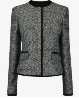 Hugo Boss Jotila tweed collarless jacket in emerald green, gold, Black & white has 5 snap button closure, black crepe piping, welted front pockets w/ flap & fully lined. Finely tailored, timeless silhouette, easy to dress up or down. Looks equally gorgeous with a little black dress or your favourite workwear as it does with jeans.