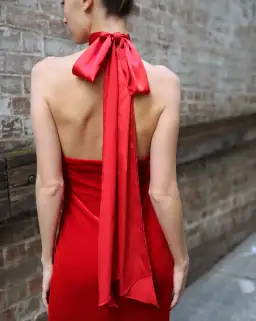 The gown features a high split on the back and a cascading bow detail that ties at the neck.