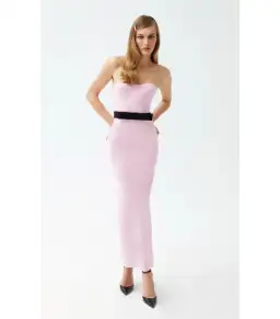 Tailored from baby pink crepe, this fitted column dress features a strapless sweetheart bodice decorated with a contrasting ribbon belt that adds a glamorous touch.