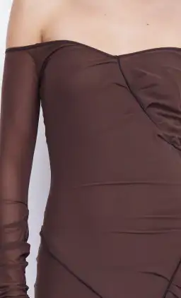 Soft mesh fabric in a flattering silhouette. The maxi dress features an off the shoulder neckline with soft gathers at bust and at hips for a perfect drape. The dress is double lined to mini length.