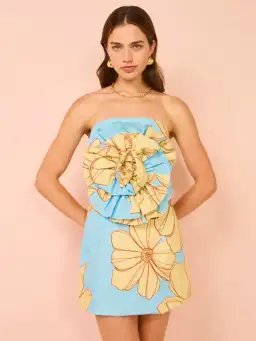 The cutest, summery mini dress, perfect for hot daytime events. Crafted from a linen cotton blend, this mini dress features a strapless silhouette, zip at the centre back and alluring ruffle floral detail on the bust. Falling to a playful A-line silhouette, this mini dress will have heads turning on vacation, summer soirees and garden parties.