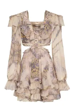 IXIAH’s Masaai Dress cultivates a free-spirited feel with intricate detailing and skin-baring cutouts to love. A multi-toned leopard inspired print, designed in house, surfaces the ultra-feminine silhouette. The mini has corset-style lacing along the centre front, back and shoulder line to add to the intricacy of the style.