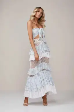 The Iconic Ixiah Outlaw set now available to rent! Created from a hand painted and illustrated watercolour print, contrasted by an embroidered lace and a play on sheerness with an open mesh. Tie top to suit your style!