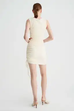 The Jacqui Mini Twist Mini Dress is crafted from textured cream fabric. Its design features a high neckline with a slash cutout. This beautiful mini dress has a waist cutout with a resin bead, and gathering on the right side creating a flattering, feminine silhouette.