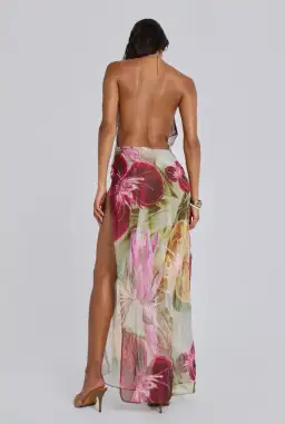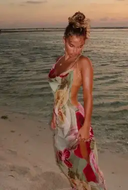 This dress screams vacay mode! Feminine and bold, the Dahlia dress falls effortlessly on the body to reveal a gorgeous feminine shape. Features a cowl neckline complimented a unique floral pattern and hand-stitched beading throughout. Semi-sheer fabric, we suggest wearing nude underwear.