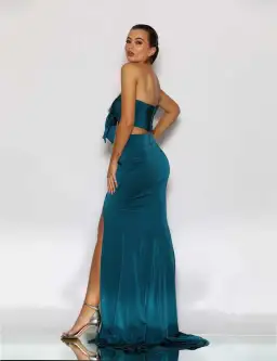 This beautiful dress features a sweetheart neckline, tie detail, trumpet silhouette with show-stopping leg split.