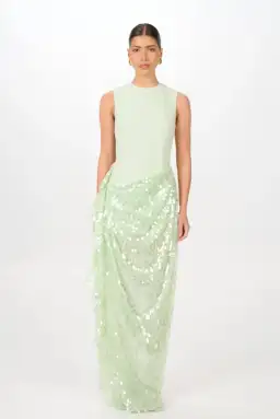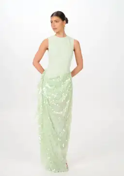 The ZOI Mini Dress embodies quiet confidence and unspoken glamour. Cut from a soft crepe that sculpts the upper body with precision, it flows into a beautifully sequined, draped skirt that catches every light with intention. The full back zip ensures a seamless fit — refined, sensual, and unapologetically powerful.