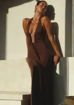 MISHA's signature Jennifer Cupro Maxi is now available in 'Cedar Brown'. With its plunging halter neckline that is finished with an adjustable wire and waterfall sash detailing the Jennifer pushes the boundaries with long clean lines that expose the wearer's cleavage ever so subtly. This silhouette sweeps the floor and contours the body. She is the ultimate party dress that can transition from day to night.