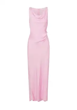 The Vikki Dress is a light pink, maxi-length dress featuring a beautiful, draped silhouette and a wrap waist with tie for added style.