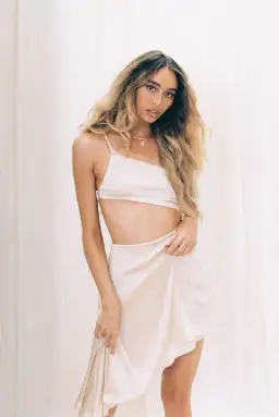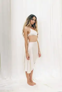 Risque Dress features asymmetrical cut out front and back meeting on one side were the two panels meet with twisted silk. The one shoulder strap is also twisted silk and the bust panel has pearl button side closure. The hem falls longer on one side and short and sultry on the other. A unique design sure to stand out.
