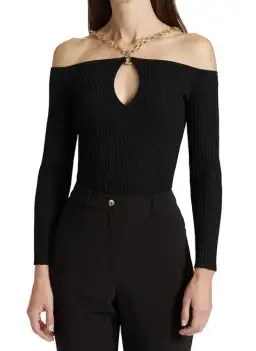 Quinn Off-The-Shoulders Top with Chain is designed for a close fit. It features chain necklace straps, front cut out. long sleeves and a straight hem.