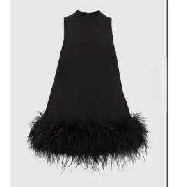 An update to the quintessential mini featuring a raised neckline and ostrich feather hemline cut to a flattering a-line silhouette. Made from stretch bonded crepe.