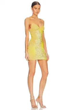 A gathered triangle bust flatters the neckline while iridescent embellishments hug the body for a playful mini