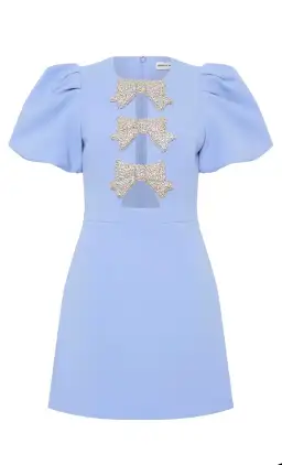 The Juliana Puff Sleeve Mini in blue is a stunning and fashionable dress designed to make a statement. Crafted from bonded crepe, it features a rounded neckline and an eye-catching diamante bow, adding a touch of opulence. The voluminous puff sleeves create a striking and contemporary look, while the fitted bodice showcases front cutouts for an alluring touch.