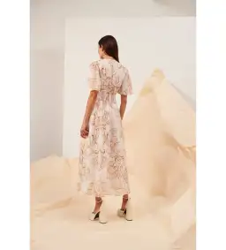 It has short flutter sleeves, v neckline, ruched waist, and a cotton voile lining.
