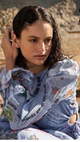 The Caracus Cut Out Gown in The Magician, a Kate Ford exclusive hand-drawn print from our Pre Fall 2023 Collection, Lost in Translation. A light weight Ramie dress, featuring flattering side ruched cut out detailing, round neckline with invisible zipper down centre back and puff sleeves with shirred panels and flare skirt.- Kate Ford exclusive print- Light weight ramie fabric- Ruched cut out detailing- Puff sleeves with shirred panels- Flare cuff- Flattering neckline- Flare hem- Invisible zipper- Cotton voile lining